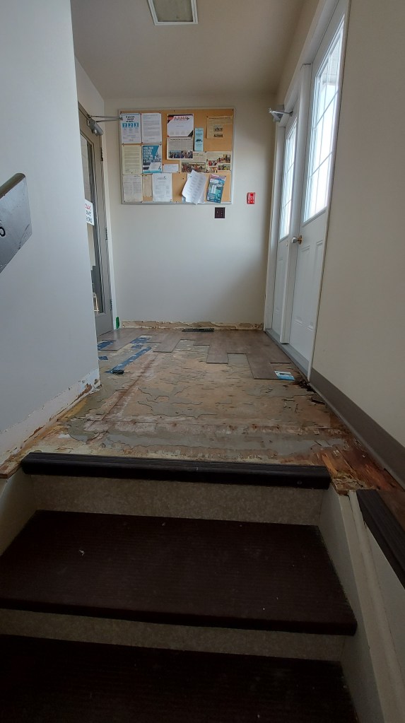 Flooring pulled up to dry the underlay. Baseboards removed to dry the walls.